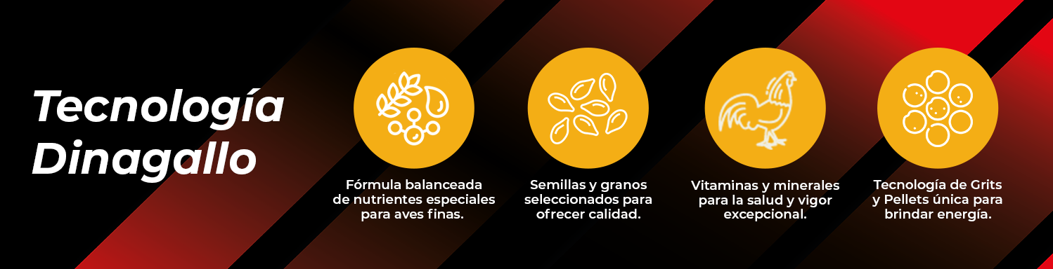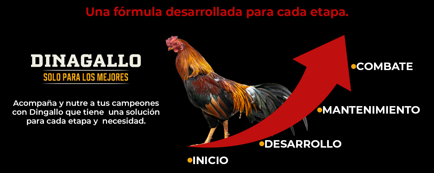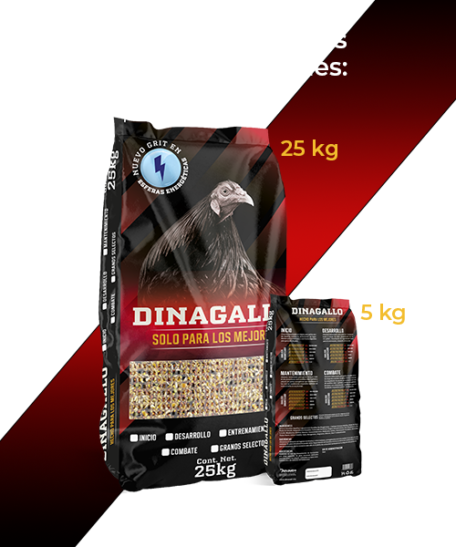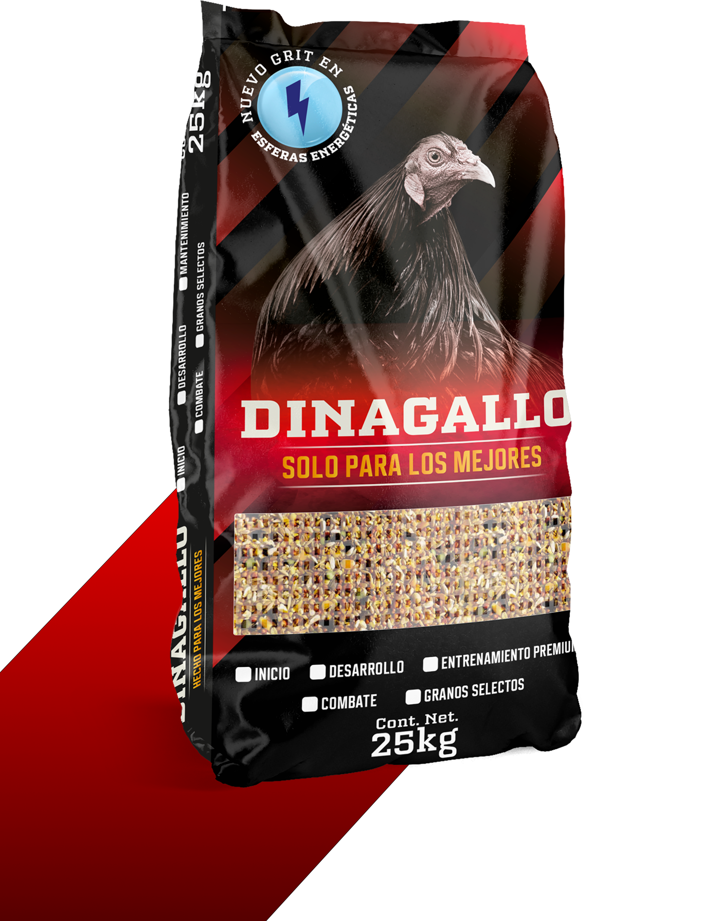 Dinagallo es un alimento balanceado que cumple con exigencias propias y únicas de las aves de combate. Desarrollado científicamente por expertos cuenta con la mejor fórmula para alimentar campeones en cada etapa proporcionando una mezcla personalizada de los nutrientes que necesita los gallos finos. Ofrece la mejor tecnología aplicada al alimento e innovando en cada fórmula.