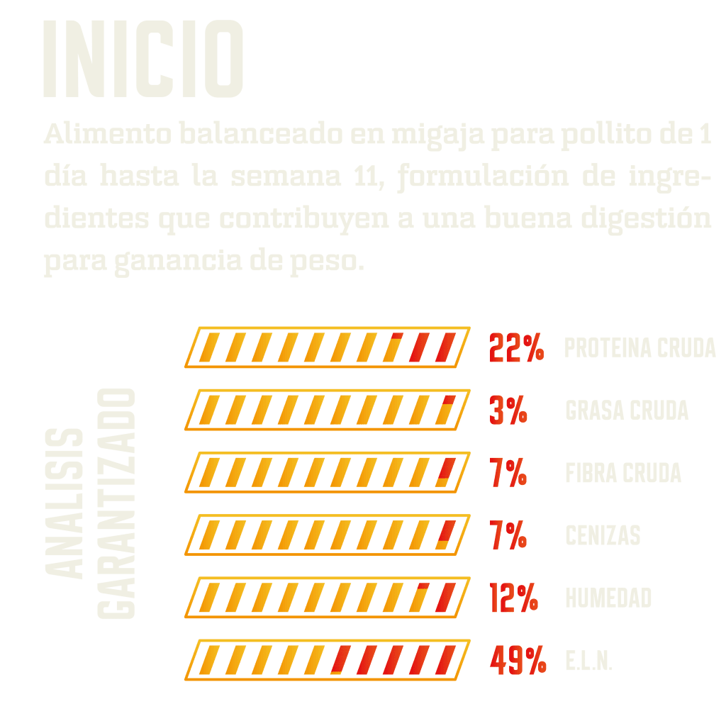 Granos Cereales, Semillas Leguminosas, Semillas De Oleaginosas Y Pellets , Granos Molidos, Pasta De Soya, Pasta De Canola, Subproductos Cereales, Carbonato De Calcio, Fosfato Monodicálcico, Sal, Vitaminas: A, D3, E, K, B1, Riboflavina, Biotina, Niacina, Cianocobalamina, Piridoxina, Colina, Pantotenato De Calcio, Minerales Traza: Hierro, Cobre, Cobalto, Yodo, Manganeso, Magnesio, Selenio, Zinc Y Antioxidantes